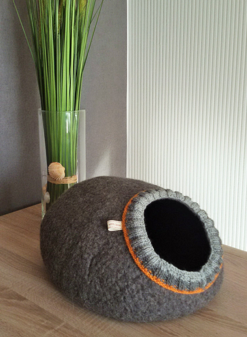 Уютный домик для кота своими руками получится если свалять или создать из ткани (ковролина) мини домик округлой формы. Затем сделать вырез и украсить его по краю вязанным шарфиком.