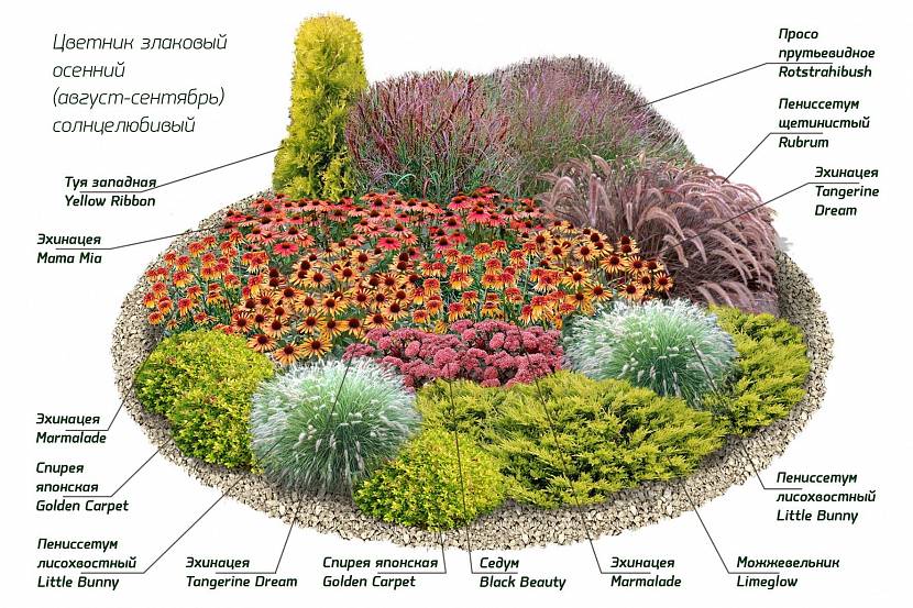 В середину высаживаются различные сорта эхинацеи. Ближе к переднему краю пенесетум лисохвостый, можжевельник, седум. Такие культуры растут «кучками», поэтому отлично впишутся в просторный круглый цветник.