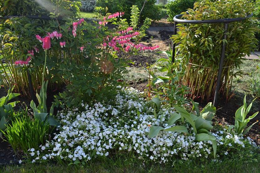 Клумба с флоксом, дицентрой и тюльпанами в тениИсточник экостиль-урал.рф