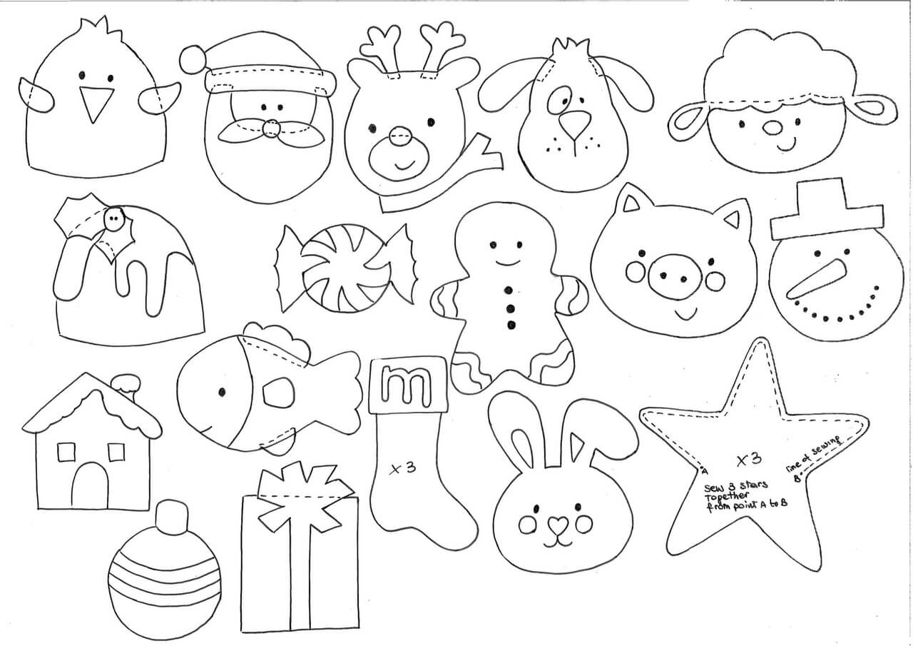 Так как фетр – материал несыпучий, то детали чаще всего выкраиваются без припусков на швы. Шаблон из картона или бумаги накладывают на поверхность материала и просто обводят по контуру мелом или специальным маркером. Самые простые шаблоны вы можете нарисовать вместе с детьми (например, контуры елочек, собачек, конфет, мишек, котиков, домиков или машинок). Такие игрушки и изготовить легче, и дизайн их будет необычным. Более сложные шаблоны, например, олени, Дед Мороз, снежинки, можно распечатать на бумаге и вырезать. После обводки шаблона деталь вырезают ножницами.
