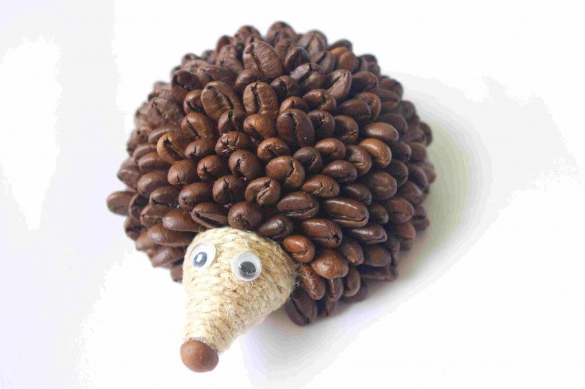 Глазки ежика можно нарисовать черной акриловой краской или сделать из двух маленьких крышек от пластиковых бутылок (не забудьте на них нанести черные зрачки и приклеить с помощью клея для пластика).