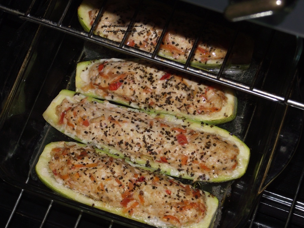 - Наполняем кабачковые заготовки начинкой, заливаем соусом, сверху посыпаем тертым сыром.