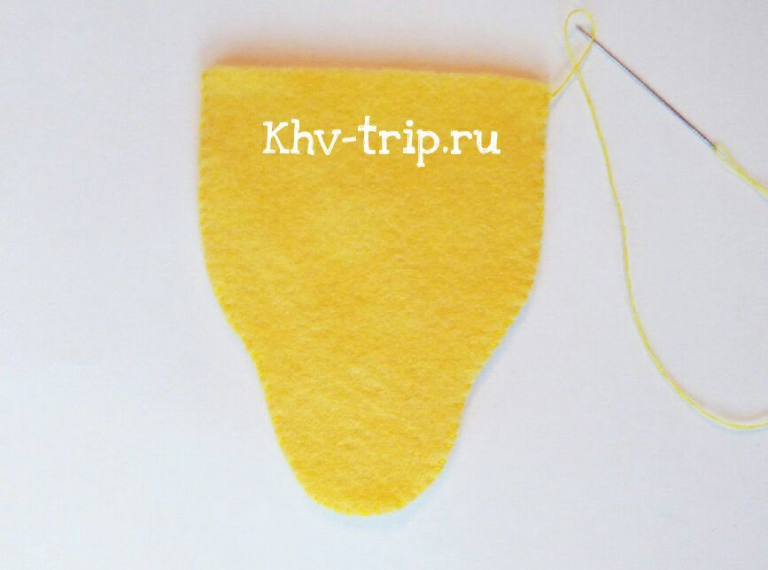 Затем складываем больший треугольник пополам и закрепляем его булавками. Пришиваем вторую сторону маленького жёлтого треугольника.