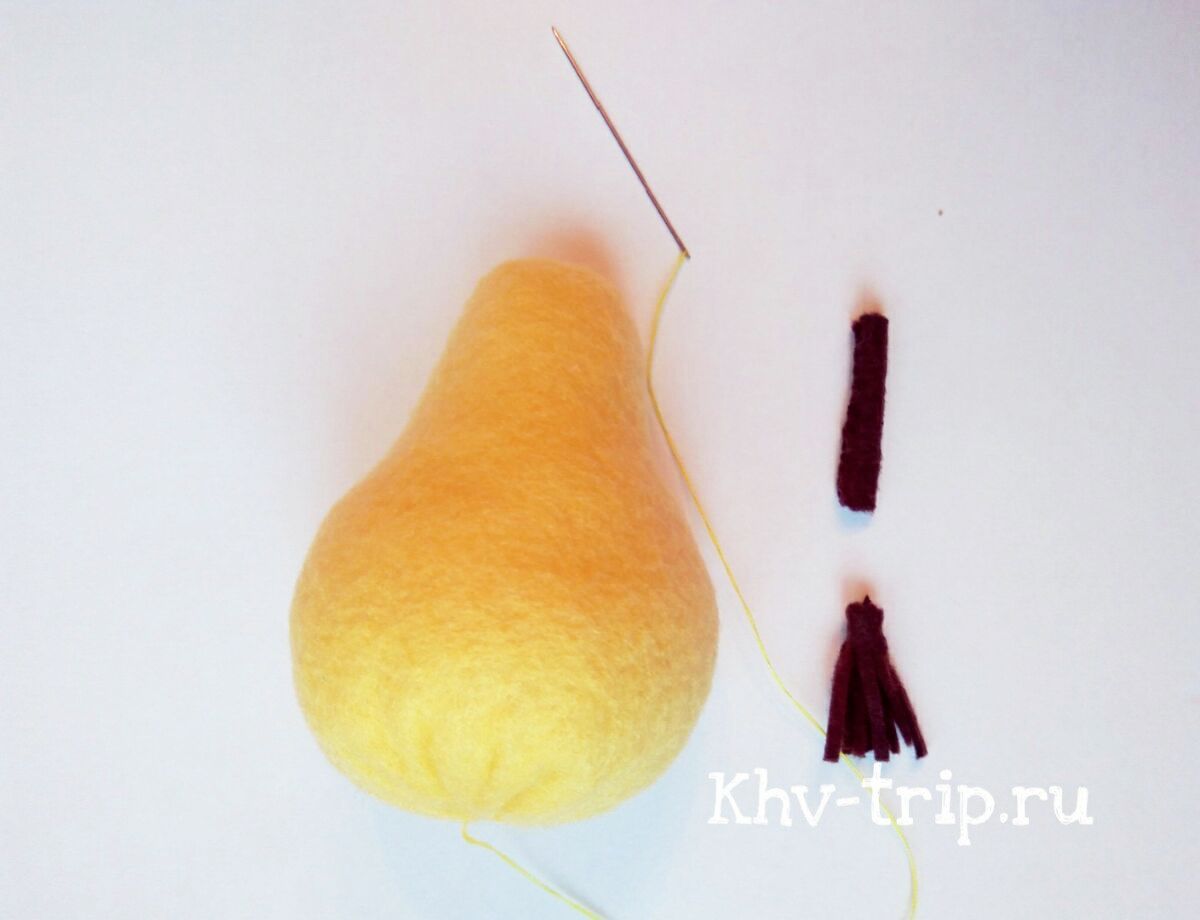 Продеваем иглу сквозь центральную ось игольницы, слегка стягиваем. Повторяем несколько раз, создавая небольшое углубление для плодоножки и чашелистика. Вшиваем их в грушу. К плодоножке пришиваем листик.