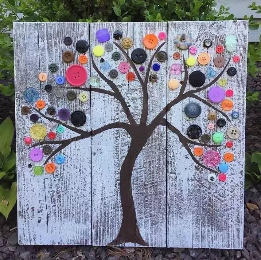 Аппликация из пуговиц оригинально будет смотреться на фоне дерева.