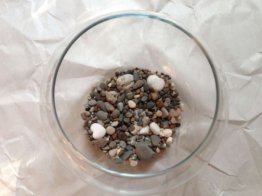 - Дно сосуда на ¼ часть наполняется керамзитом и галькой. Примерная толщина слоя составляет 2-3 см.