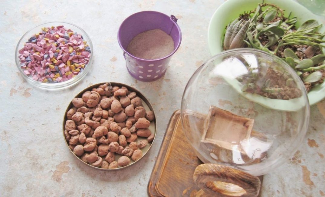 - Почва (грунт) – подбирается в зависимости от того, какой вид растения будет высаживаться. Суккулентам и кактусам выкладывают слой из торфа и мелкого песка в пропорции 2:1, влаголюбивым культурам насыпают в равных частях вермикулит, землю и перлиту. Чтобы поддержать необходимый уровень кислотности почвы, добавляют муку. Еще одним способом приготовления почвосмеси является покупка готовой почвы в цветочном магазине, которая идеально подойдет для каждого вида зеленых обитателей садовой витрины