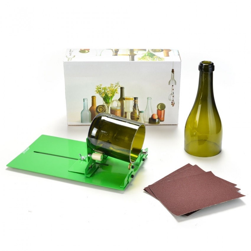 Здесь потребуется стеклорез. Можно использовать заводскую модель или изготовить самостоятельно. Конструкция самодельного устройства может быть различной: главное, чтобы бутылка и режущий элемент надежно фиксировались, но бутылка при этом свободно вращалась.