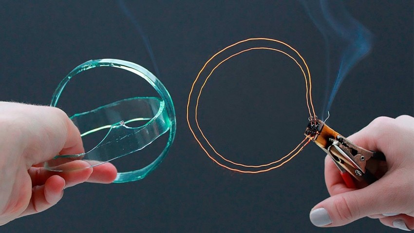 Источник тока отключается, а места соприкосновения стекла с проволокой интенсивно сбрызгиваются водой из подготовленной бутылки