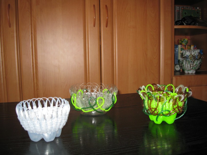 Дизайнерскую вещь можно получить также из бутылки, разрезанной в продольном направлении. Для работы требуются следующие материалы: