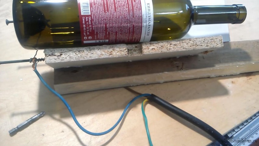 для фиксации проволоки в донной части необходимо установить бутылку на асбестовый кусочек, вообще самыми проблемными местами бутылки при разрезании считаются горлышко и дно;