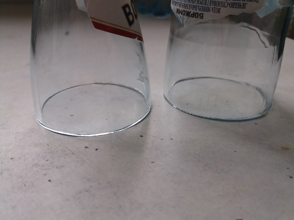 На бутылке делается надрез по кругу бутылки при помощи стеклореза или сверла. Для разрезания понадобится чайник с кипятком и из-под крана холодная вода. На линию надреза небольшой струйкой льется горячая вода, желательно не заходить за границу надреза. Затем бутылка размещается под струю холодной воды. Процесс чередования горячей и холодной воды нужно повторять до раскола тары на части. Края зачищаются наждачной бумагой, сначала грубой, затем мелкой.