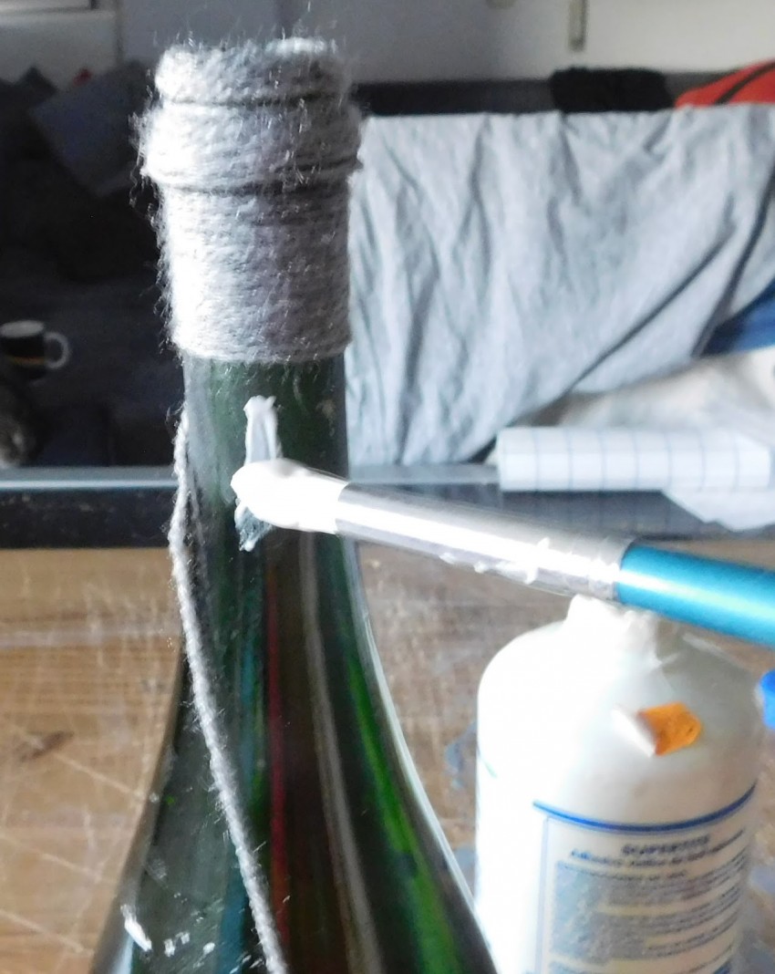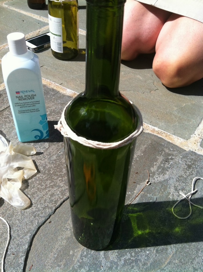 Бутылка оборачивается ниткой для пряжи или толстым хлопковым шнуром в 3-5 оборотов. Кончики нити связываются, а излишки отрезаются. Затем нить снимается, помещается в небольшую емкость, поливается ацетоном до полного намокания. Ацетон можно заменить жидкостью для снятия лака или керосином