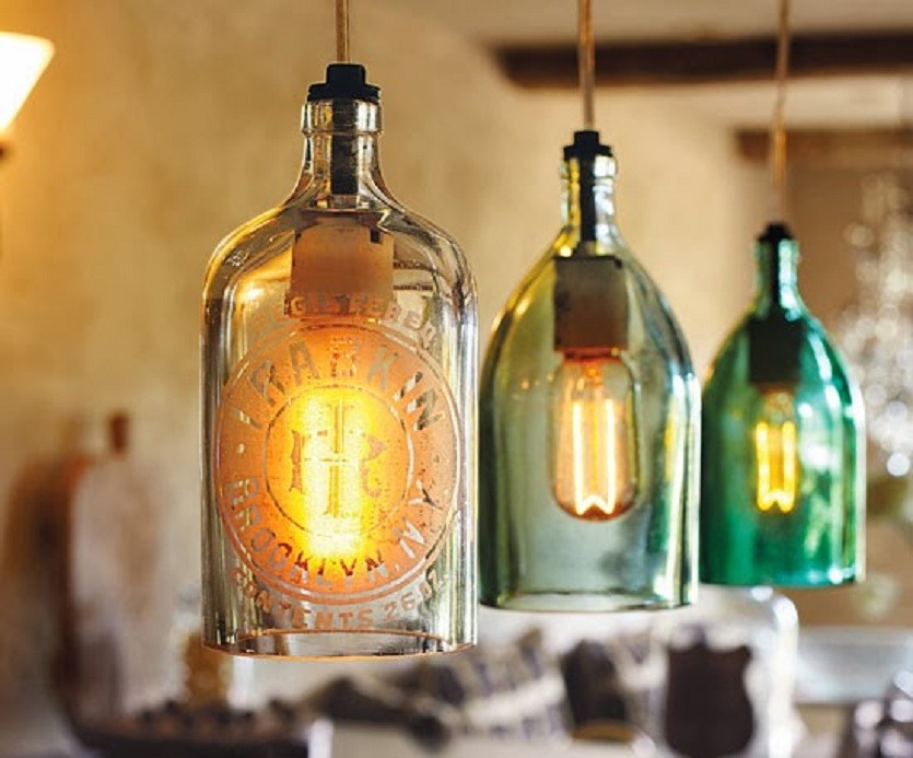 - Люстры. В этом случае требуются познания в области электрики, но при необходимости можно обратиться к мастеру, который произведет разводку проводов, установит патроны, а плафоны можно сделать самостоятельно на свой вкус. Верхняя часть бутылок окрашивается акриловыми термостойкими красками в разные цвета, рожков может быть 2, 3, 4, 5 – на свое усмотрение.