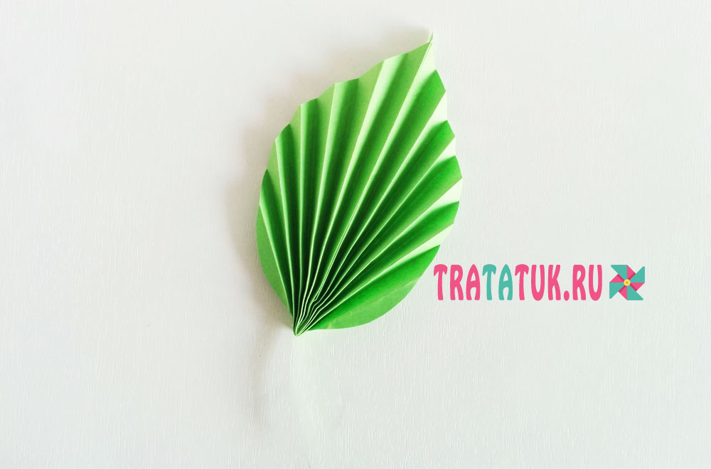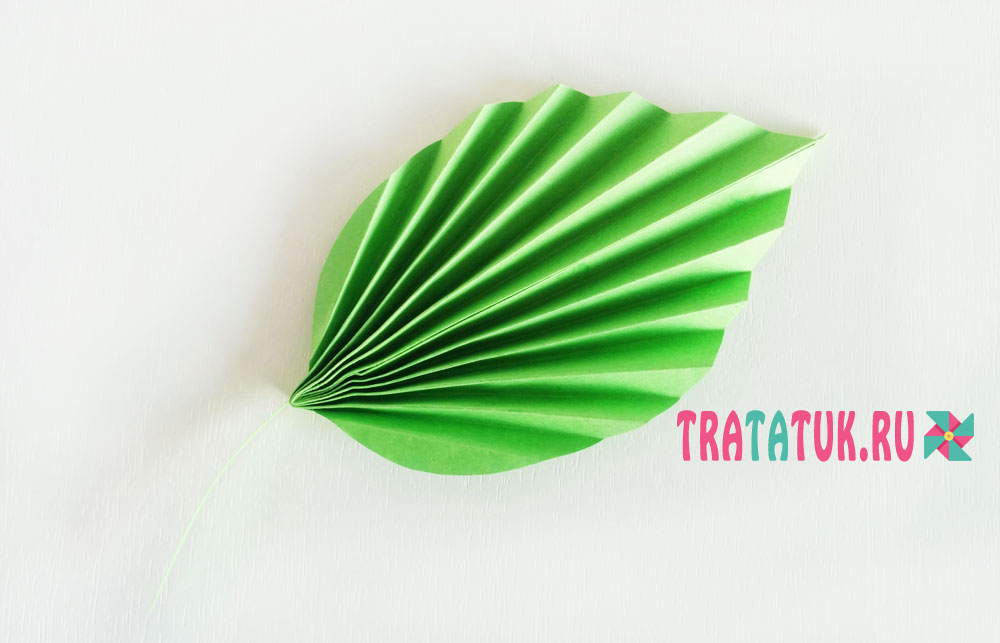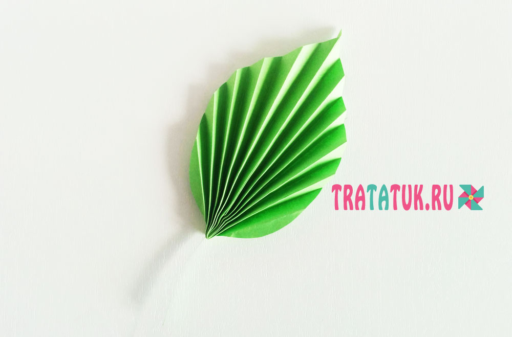 - Для изготовления листьев зеленый квадрат сложите зигзагом, чтобы наметить линии.