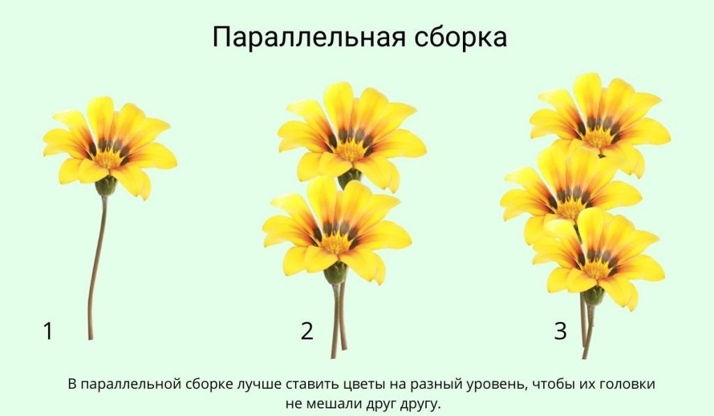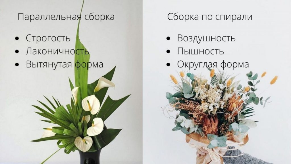 Есть две основные техники сборки: спиральная и параллельная. В параллельной сборке цветы укладываются один рядом с другим так, чтобы их стебли были параллельны друг другу. В спиральной технике стебли расположены по диагонали и имеют одну точку соприкосновения. В чём разница?