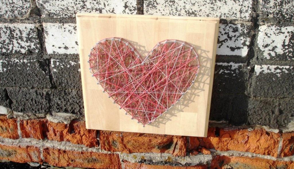 Из пряжи и гвоздей можно сплести любую картину, главное подобрать шаблон и материалы. Начинать работу необходимо с чего-то простого, поэтому предлагаем вам изготовить сердечко.