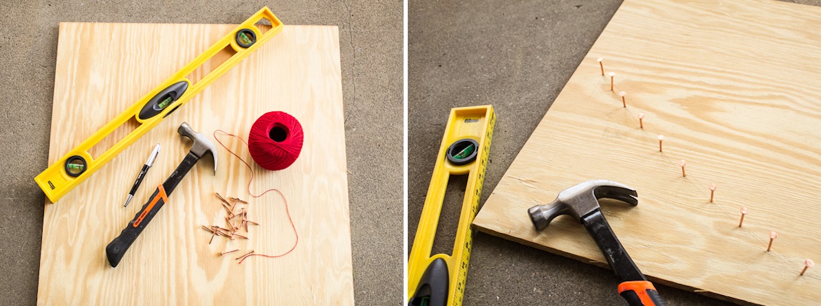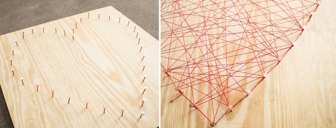 Совет: вместо деревянной основы можно использовать лист пенопласта. Работать с этим материалом легко, гвозди вставляются в него без молотка, но при заполнении пространства нитками их нельзя сильно натягивать. Если хоть один гвоздь выскочит под сильным натяжением, вся работа пойдет насмарку.