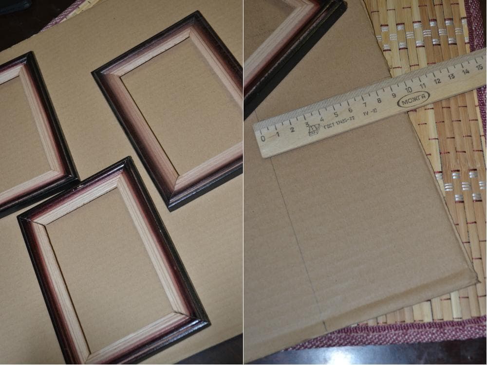 Для начала подготавливаем рамки для картин. Измеряем их размеры и переносим на картон.