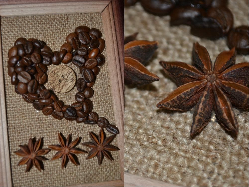 На нижнюю часть приклеиваем три штуки бадьяна. Над ними начинаем выкладывать красивое сердце из кофейных зерен.