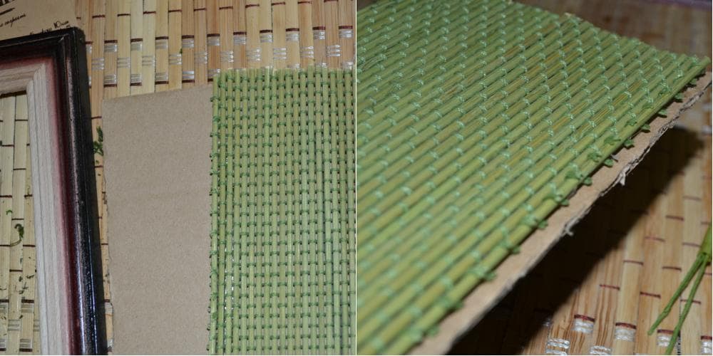 По размерам заготовки из картона вырезаем кусок бамбукового коврика. Склеиваем две детали между собой.