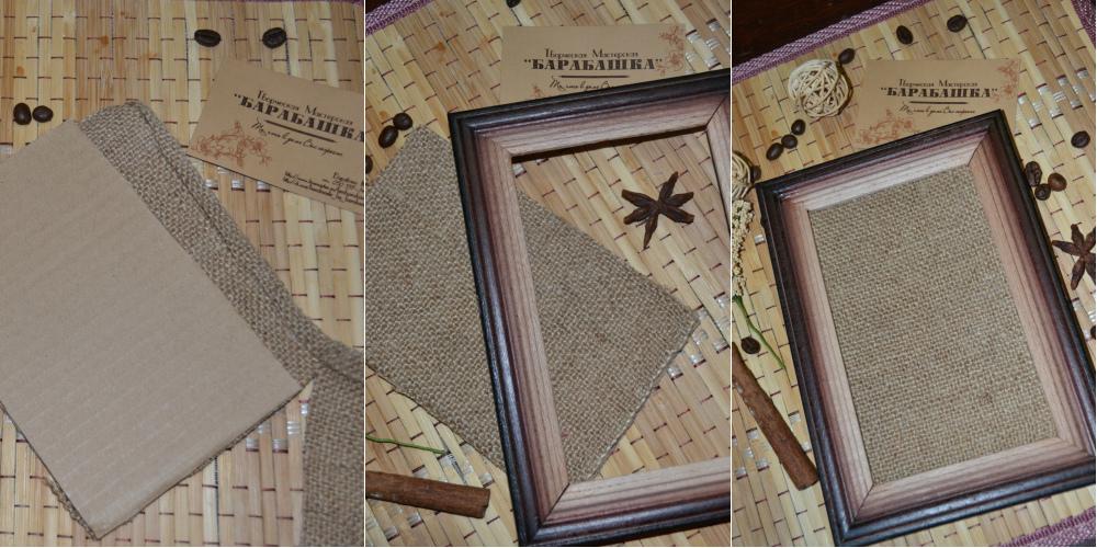 Приклеиваем мешковину на картон и вставляем в рамку.
