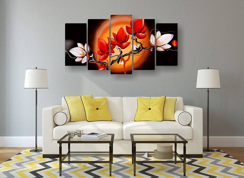Основной композиционный модуль располагают по центру. Разделение на сегменты делают изображение динамичным, ярким. Исчезает ощущение монотонности цельного полотна. Модули-картины могут быть одинаковы по размерам, но эффектнее смотрятся композиции, состоящие из секций с различными параметрами.