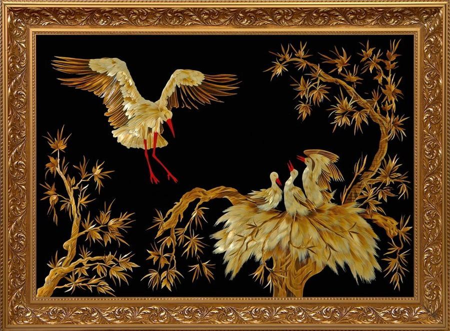 Соломка прекрасно смотрится на темном фоне. В качестве основы подходит, например, черная или темно-синяя бархатная бумага, ткань соответствующих цветов и т.д. Начинать изготовление картины нужно с эскиза. Найдите подходящий рисунок, переведите его на прозрачную бумагу. Переведите на такую же бумагу каждую деталь рисунка. Наклеивать соломку нужно сначала на бумажные детали, а уже потом на фон. Подберите к каждому фрагменту соломинки нужного цвета. На фоне сделайте схему: наметьте положение каждой детали. Наклейте их на заготовки клеем ПВА. Следите за тем, чтобы ленты ложились плотно, без просветов. Чтобы приклеить соломенную ленту, смажьте ее клеем с изнаночной стороны, наложите на деталь и прижмите. Лишний клей удалите. Прикрепив все ленты, дайте заготовке просохнуть, затем подровняйте деталь строго по контуру и положите под стекло. Сделав таким образом все детали, расположите их на фоне и приклейте. Положите картину под пресс и дождитесь, пока она высохнет, а затем вставьте в раму или окантуйте.