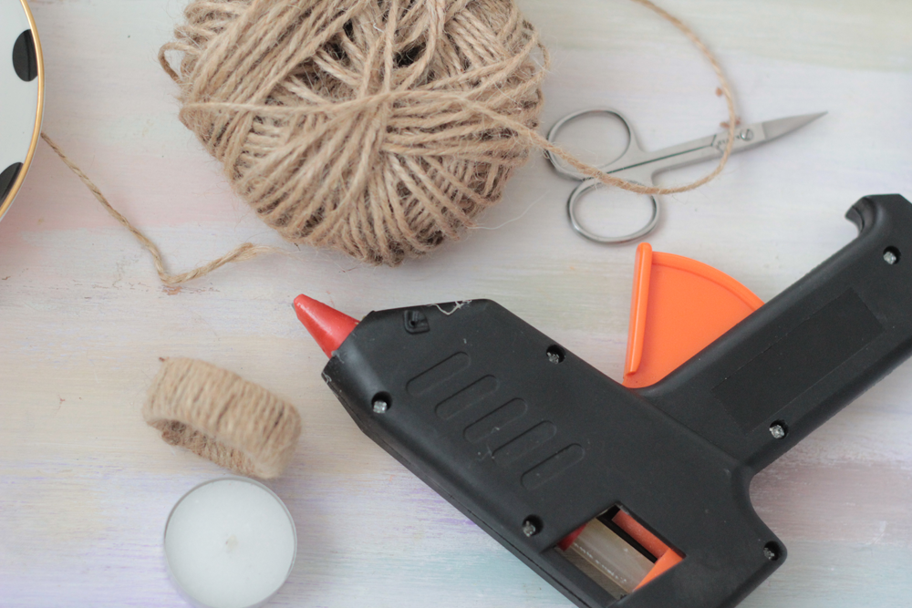 - Отрежем большой кусок веревки и при помощи пистолета приклеим ее край на внутреннюю сторону кольца.