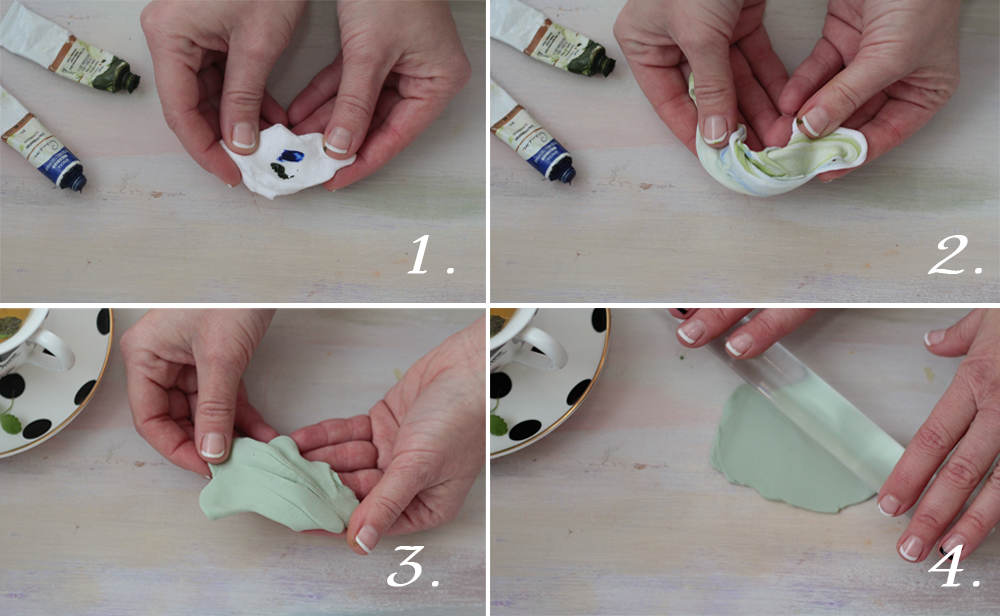 - Для начала возьмём глину и смешаем её с масляными красками. С синей и зелёной.