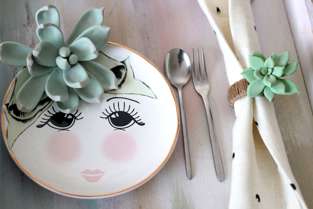 Вот так, в результате столь несложных манипуляций вы непременно поразите родных удивительно нежной и природной сервировкой стола. Кстати, как вы могли заметить, кольца для салфеток, декорированные суккулентами, весьма гармонично смотрятся с посудой MissEtoile. Так что не упустите возможность порадовать себя и сделать вашему столу лучший подарок на новый год своими руками.