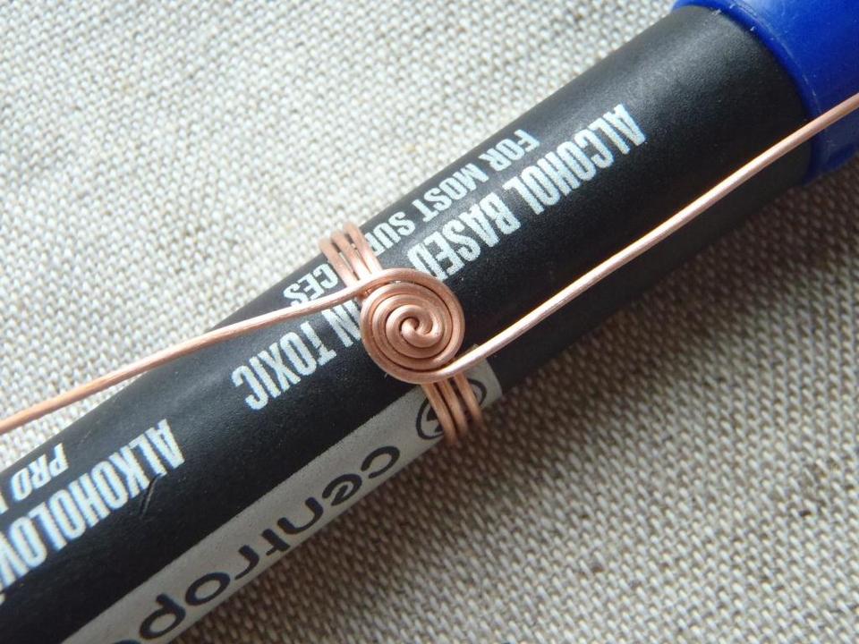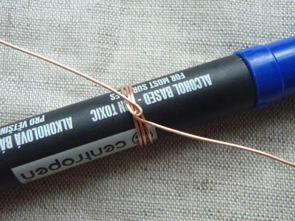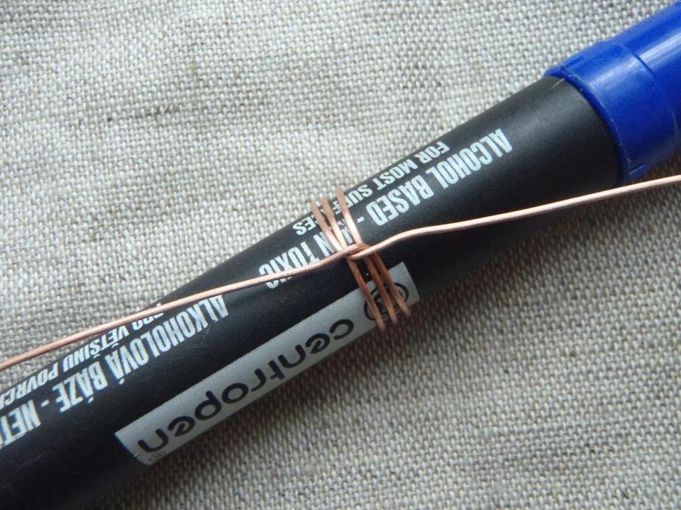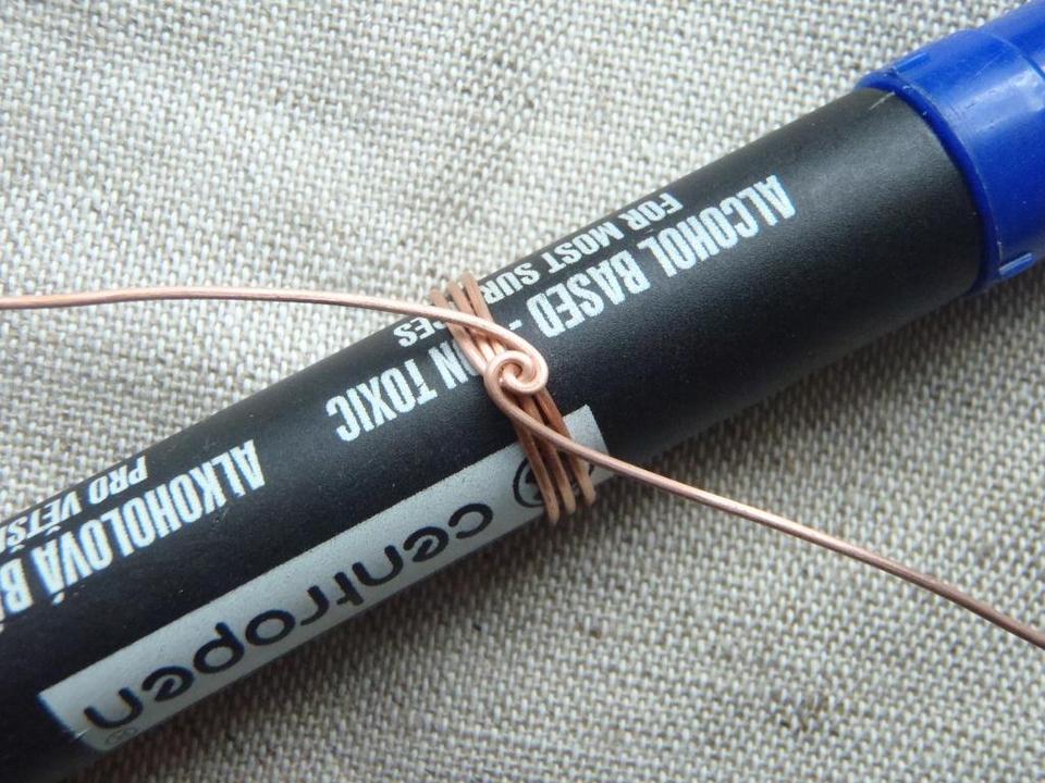 - Возьмите ригель (фломастер), прижимая пальцем канитель, сделайте несколько витков по размеру пальца, вокруг него. Обычно достаточно двух витков.