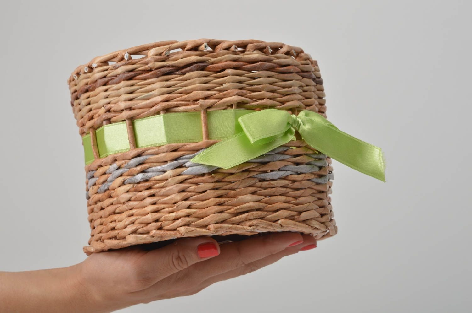 Покрасить готовую корзинку можно в любой цвет. Очень эффектно смотрится коричневый. В качестве декора можно использовать ленты.