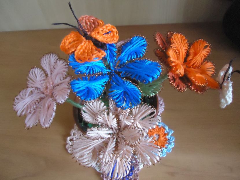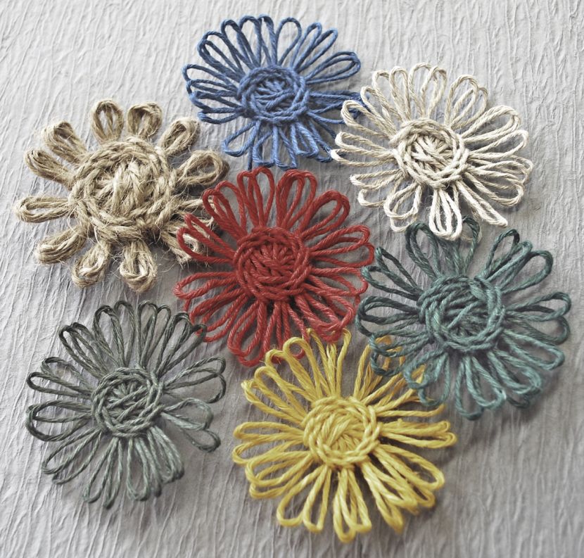 Нитки, оставшиеся от вышивки можно превратить в прекрасные цветы. Принцип изготовления цветов похож на изготовление абажура.