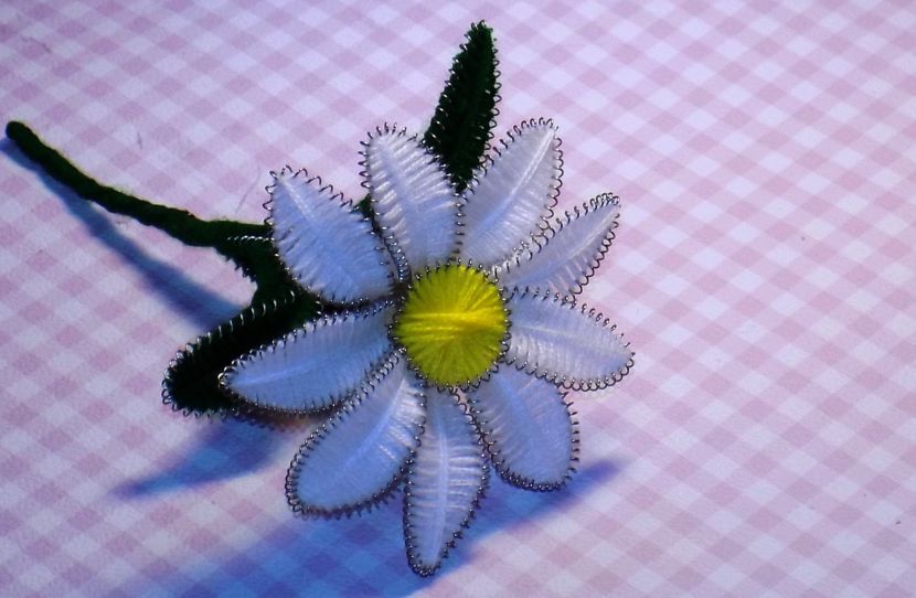 - Начнем с подготовки самих лепестков. На тонкую спицу плотно намотайте проволоку, у вас должна получиться спираль. Выньте спираль, и соедините концы друг с другом туго их закрутив. Обматывайте нитками спираль, пропуская нитки через витки. Старайтесь намотать нитки вплотную без зазоров. Когда лепесток будет готов, пропустите нить по центру, тем самым вы сформируете жилку лепестка. Для формирования цветка вам понадобится 5-7 лепестков.