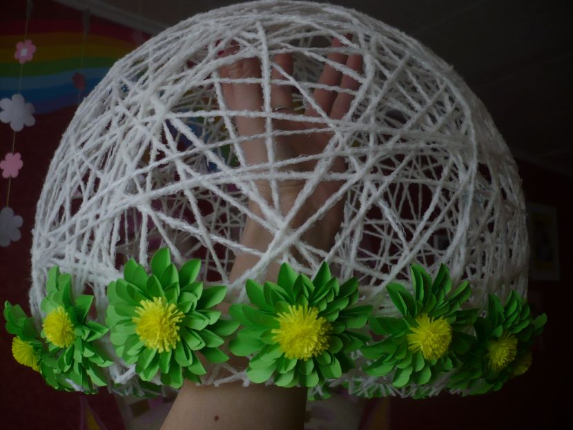 Для начала работы надуйте шар подходящего для абажура размера. Намажьте поверхность шара клеем. Обмотайте шарик нитками во всех направлениях. Старайтесь, чтоб не было зазоров. Промажьте еще раз клеем и оставьте заготовку высыхать.