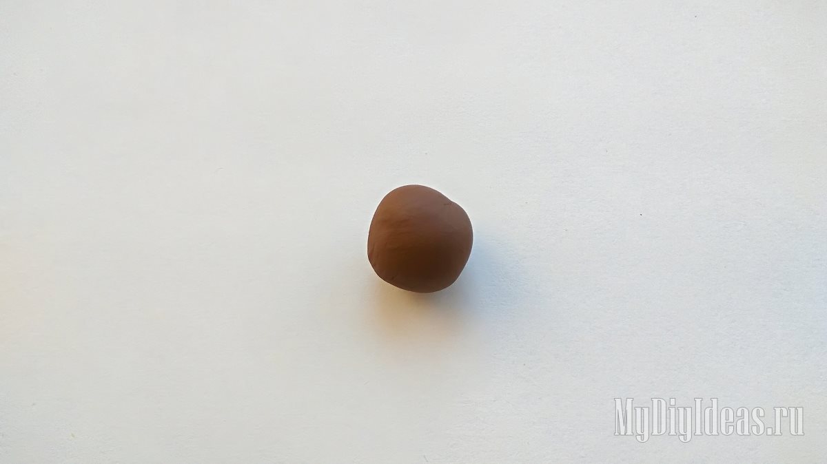1) Прежде всего, нужно подготовить все необходимое для работы и вычленить основные части тела животного. Можно лепить фигурку поэтапно, начиная с головы, заканчивая ногами. Рассмотрим методику лепки головы. Возьмите небольшой кусочек коричневого пластилина и разомните его в руках.