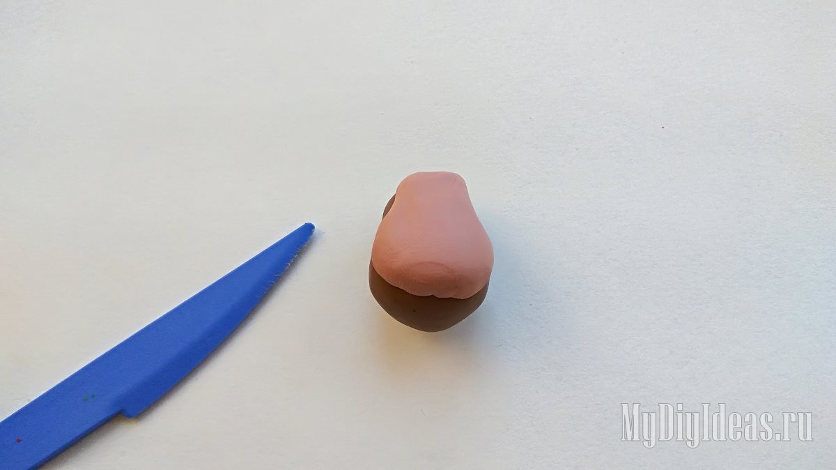 2) Подготовленный коричневый кусочек превратите в грушу, то есть верхняя часть головы должна быть более узкой, а нижняя – более широкой и округлой. Также нужно создать бежевый пластилин, особенно, если такого бруска нет у вас в наборе. Бежевый цвет легко получается, если смешать белый и капельку коричневого. Наклейте на коричневую грушу бежевую лепешку и также пальцами придайте ей подобную форму. Бежевая часть – это лицо обезьянки.