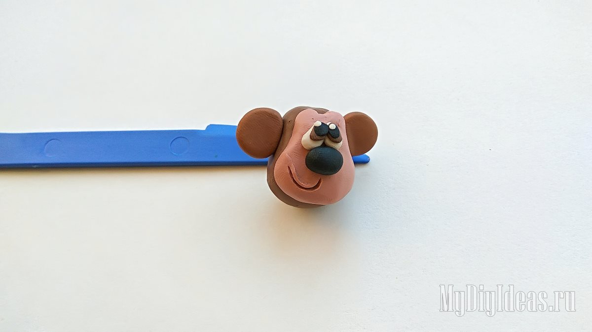 Получившуюся деталь необходимо закрепить в нижней части мордочки. Возьмите стек с круглым концом маленького диаметра и нарисуйте улыбку и носик для вашей обезьянки.