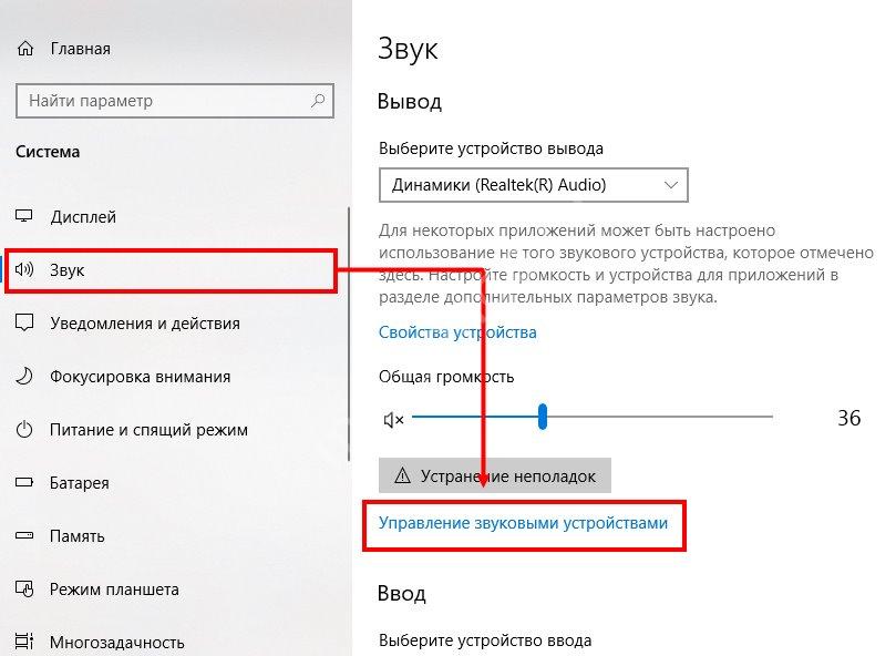 - Найдите вкладку «Звук». Появится список доступных устройств ввода и вывода аудиосигнала.