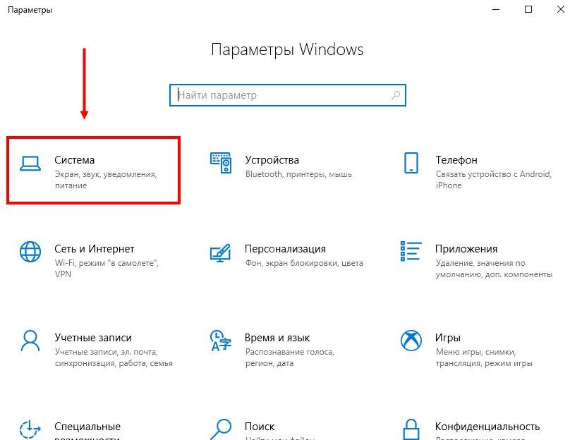 Через меню «Пуск» вновь открываем раздел «Параметры» и находим вкладку «Система».