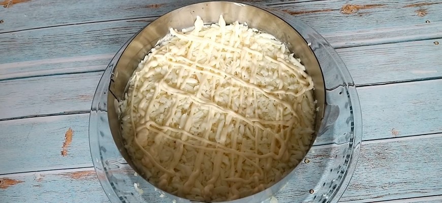 Вторым слоем идет тертый (на крупной терке) сыр — 100 граммов. И не забываем про майонез!