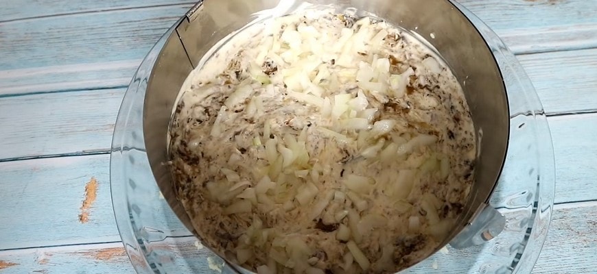 Измельченный лучок для хруста и пикантности (майонез, да-да) станет четвертым слоем.