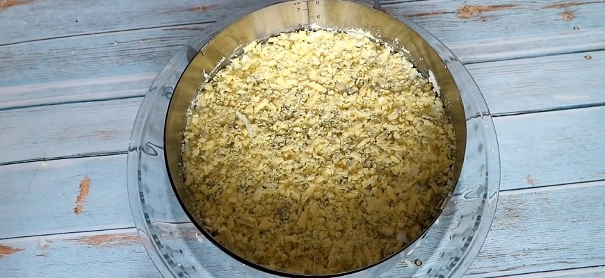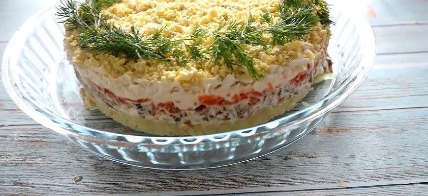 Аккуратно снимаем формовочное кольцо — салат готов. Перед подачей я бы советовала выдержать его 1-2 часа в холодильнике, чтобы слои пропитались майонезом. И еще один нюанс: подавайте салат не сразу после холода, а спустя минут 15 (пусть постоит на кухонном столе). Для чего? Чтобы сливочное масло стало мягким и нежным.