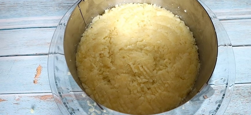 На дно формы первым слоем выкладываем натёртый на крупной тёрке картофель. Распределяем его равномерно по дну, немного придавливая вилкой или ложкой. Трамбовать сильно не нужно, так как слой плохо пропитается и будет в итоге сухим. Немного присолим слой, так как при варке соль в картофель не добавлялась.