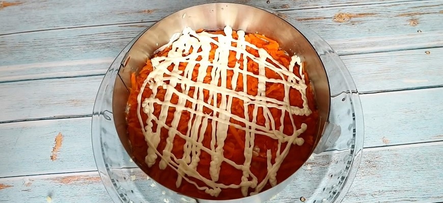 На яйца раскладываем тёртую морковь и хорошо промазываем майонезом. При желании можно немного посолить, особенно если морковь сильно сладкая.