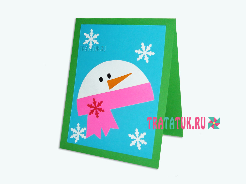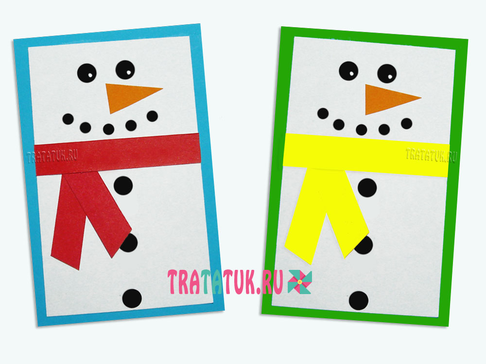 Еще один легчайший вариант открытки со снеговиком, который по силам деткам младшего дошкольного возраста. Детям достаточно вырезать круг, перерезать его напополам и приклеить на картон-основу. Дорисовать глаза, приклеить нос с с шарфиком и открытка готова.