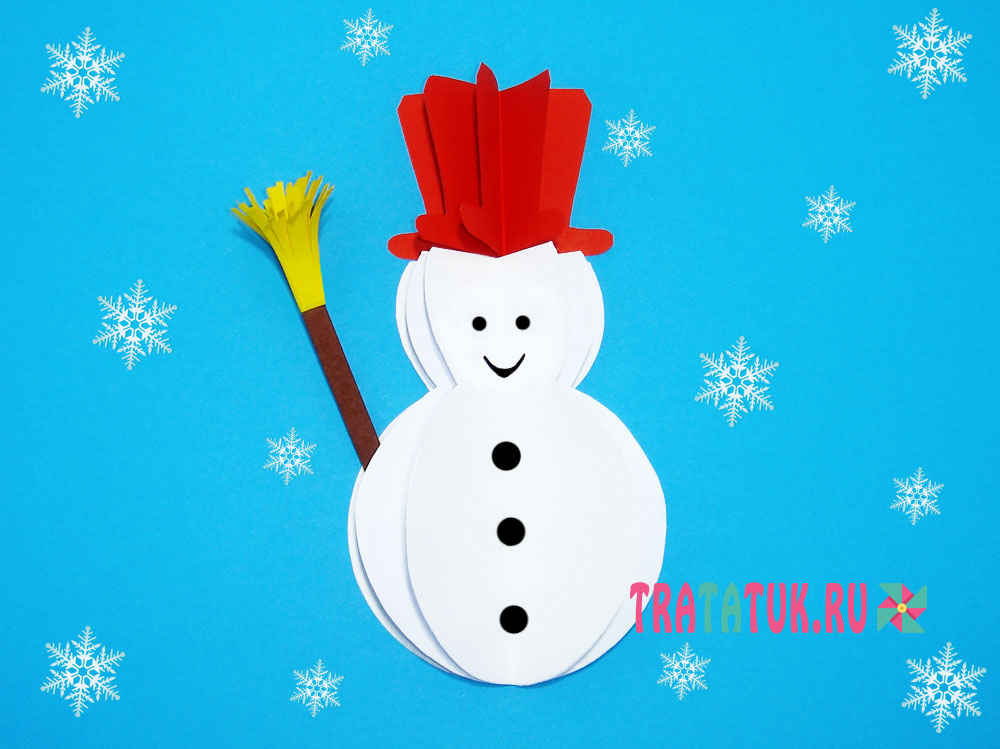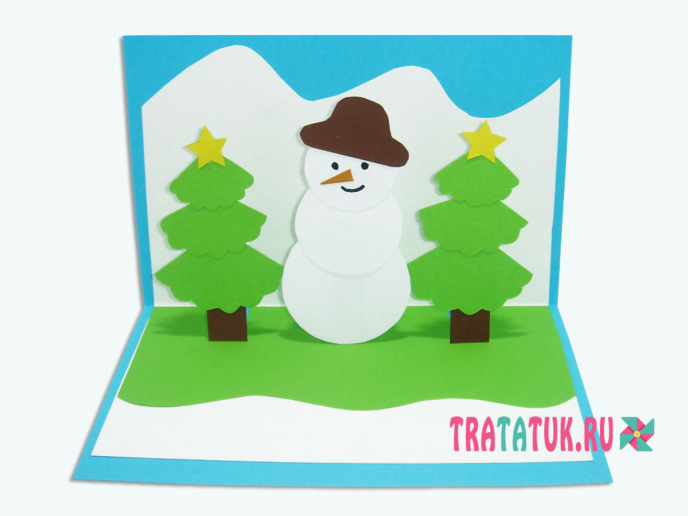 Очень красивой получается открытка с объемным снеговиком. И сделать ее очень просто. Нужно нарисовать снеговичка, вырезать несколько одинаковых заготовок, а затем приклеить в определенном порядке. Таким же образом сооружается и колпак.
