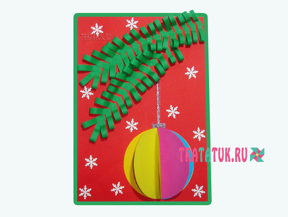 Поэтапное исполнение: новогодняя открытка с объемной веткой и игрушкой