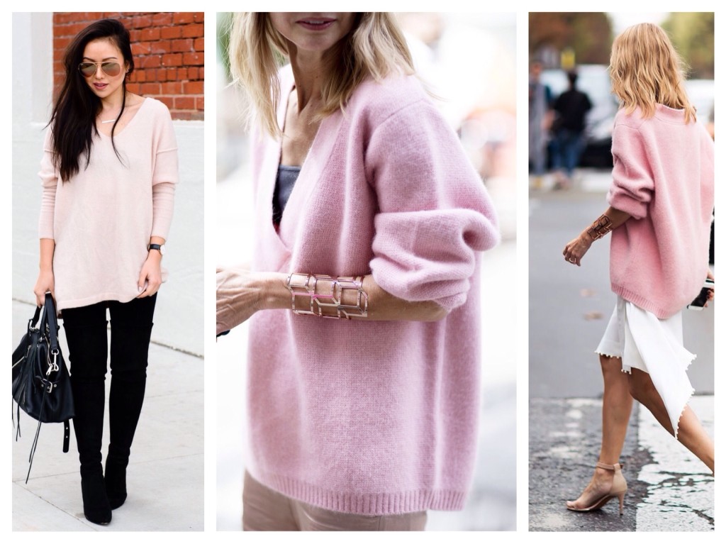 Джемпер или жакет цвета кварца, пудры, зефира носите с белым топом и такими же брюками либо с классическими нежно-голубыми джинсами.